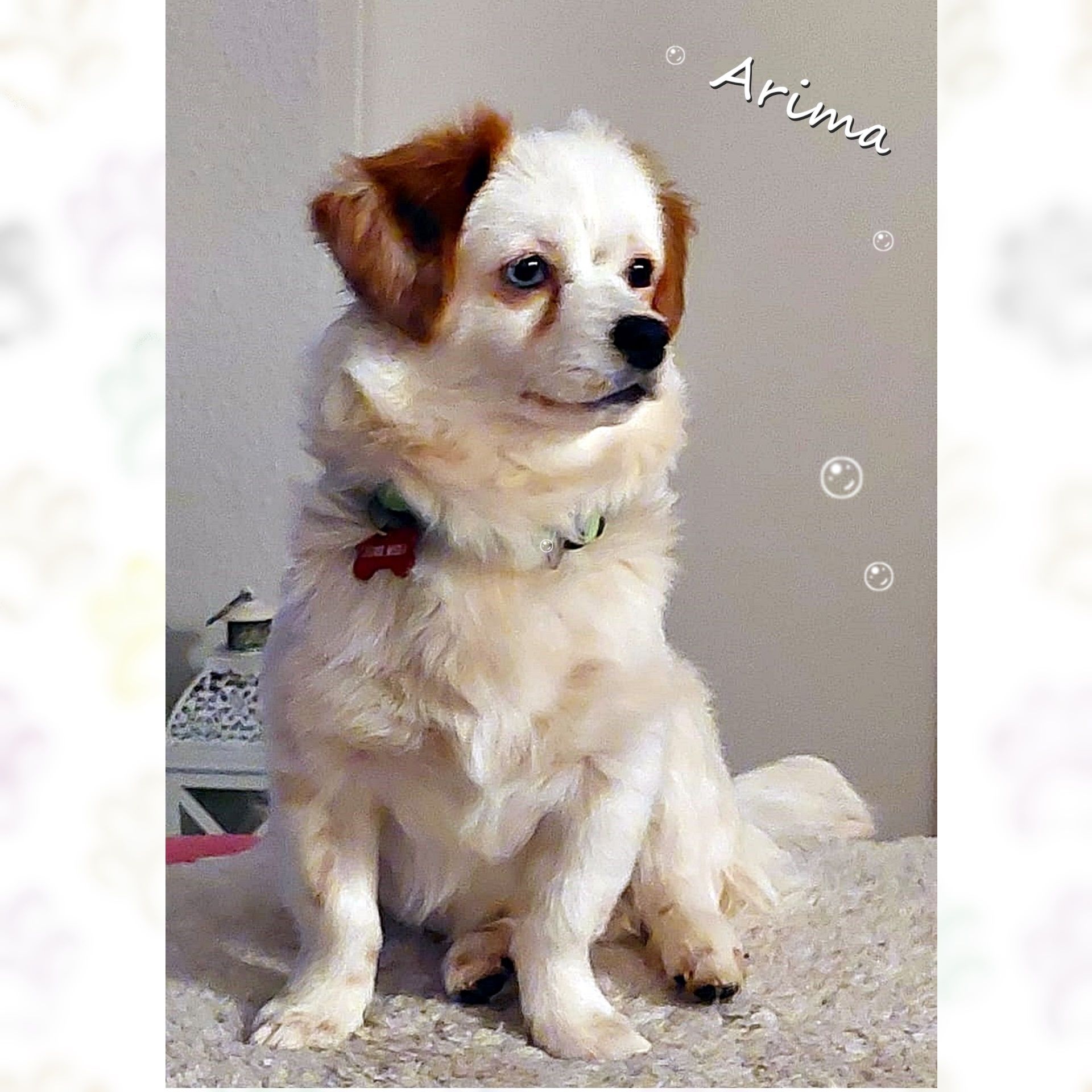 Arima hat ein rechtes Auge der Farbe blau und das linke ist dunkel. Ihre karamellfarbenen Öhrchen sind der Hingucker und ein Fell wie Magie. Sie fällt tatsächlich überall positiv auf. Arima geht gut an der Leine, ist stubenrein und bleibt mit anderen Hunden zusammen auch mal alleine zuhause. Da Arima wenig sehen kann muss sie viel mit ihrer Intelligenz arbeiten. Wenn sie sich neu orientiert, dann zittert ihr Köpfchen etwas – denn es ist jedesmal eine geistige Leistung sich zurechtzufinden, was sie stets gut meistert. Stress kann sie nicht so gut vertragen – sie sucht ein sehr harmonisches Zuhause am besten ländlich gelegen. Wenn man sie gut führt, dann entwickelt sie sich weiterhin so bravourös, wie sie es derzeit tut. Sie macht uns sooo viel Freude.