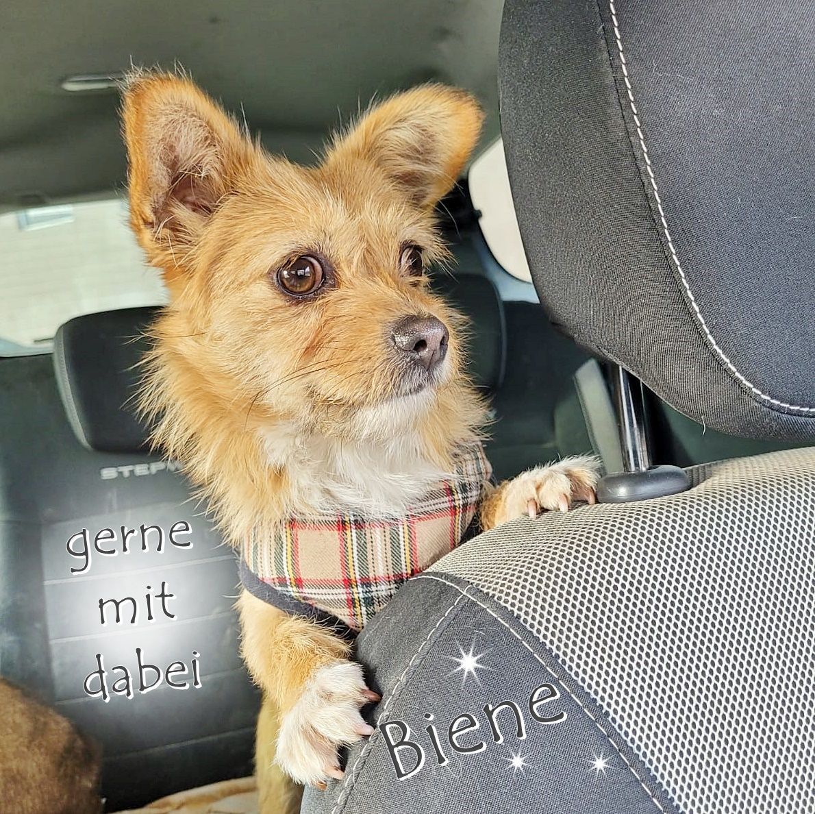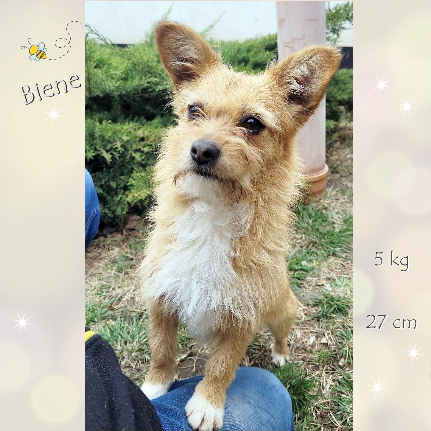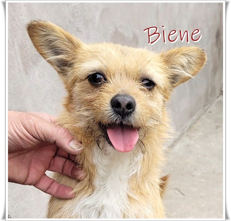 Unsere kleine Biene ist wohl zauberhaft in all ihrem Tun und auch ihre Ausstrahlung lässt uns staunen, unglaublich welche Herzlichkeit und Vertrauen sie uns entgegenbringt. Zugleich ist sie witzig und bringt uns stets zum Lachen. Ihre Mimik und Gestik erinnert an Disneys Figuren – voller Emotionen und mit Witz und Charme wickelt sie uns in Windeseile in ihren Bann. Mit ihren etwa 5 kg und nur ca. 27 cm Schulterhöhe ist sie eine sehr kleine Maus. Die süße Biene ist sanft, verständig und weiß, was sich gehört. Hatte sie doch schon immer in ihrer liebevollen Familie gelebt, gemeinsam mit ihrem Hundefreund. Ihr Herzblatt ist der Barney, ein etwas älterer, sanfter Freund, mit dem sie bisher das Leben teilte. Er ist mit seinen knapp 35 cm auch ein kleiner, gut händelbarer Freund. Er ist ebenso ausgeglichen, ein Knuddelbär und eine gute Seele. Zwei, die sich blind verstehen.
