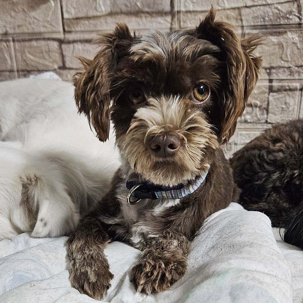Große, kristallklare Kulleraugen in Braun, so unschuldig schauen sie drein. Es harmoniert so schön zu ihrem hellen Schnuti – wie gemalt ist ihre Farbgebung und gibt ihr einen unvergleichlichen Reiz. Schokobraun ist ihr Haar, auffallend und selten ist diese Farbgebung bei Bichon und artverwandten Rassen. Da auch ihre Stupsnase und die Lippen braun sind – wird sie das begehrte Schokopigment in sich tragen. Finchen wird später, wenn ihr Haar wieder gewachsen ist, eine besondere Ausstrahlung bekommen. Ein so liebevolles Mädchen - wie gemalt. ❤️