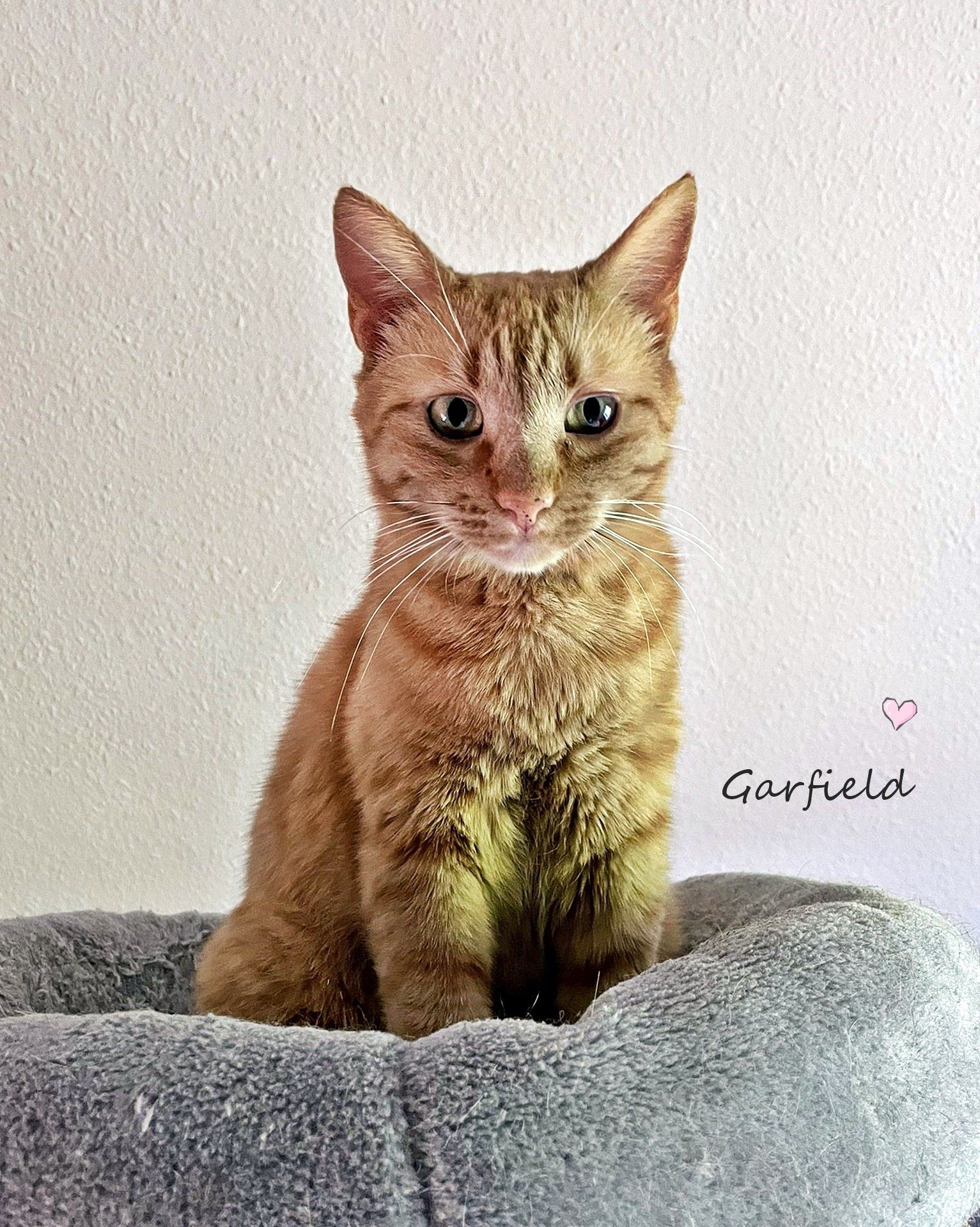 Mittlerweile ist der hübsche Garfield schon komplett untersucht, auf verschiedene Krankheiten getestet, auch geschippt, er ist komplett geimpft, ebenso entwurmt, kastriert und besitzt seinen eigenen EU-Pass.