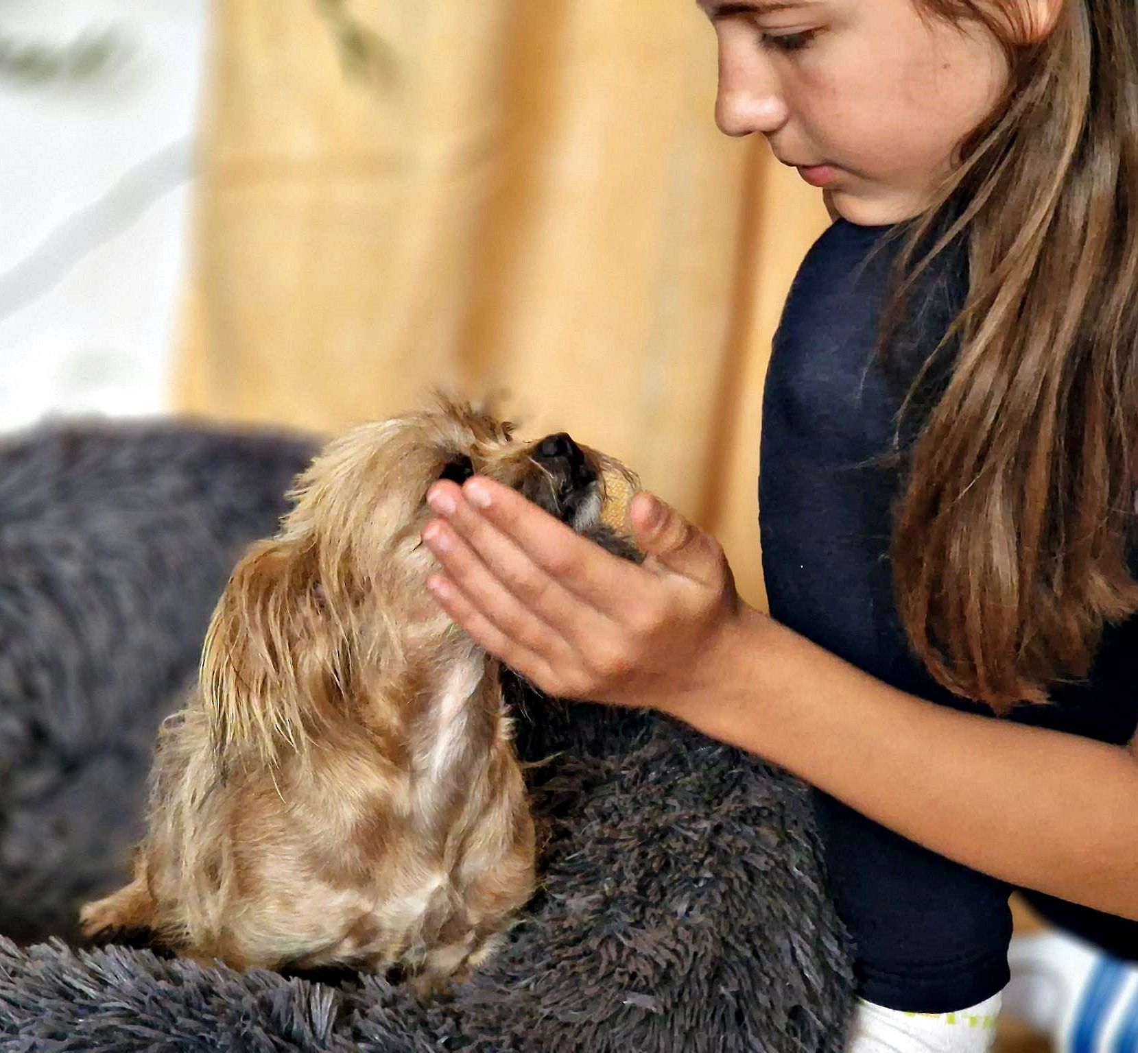Dieses kleine Mädchen möchte liebevoll gehändelt werden, als gefühltes „Baby“ schmiegt sie sich gerne an, wenn man sie in den Arm nimmt. Dann schluckt sie tief und genießt mit allen Sinnen. Zu herrlich anzusehen, wie glücklich sie dann ist. Klein Kuky ist tatsächlich eine kleine Maus, wie man sie so selten sieht. Klein, zart, liebevoll und sie bedarf den Schutz ihrer Menschen. Gerne gesellt sie sich zu ihnen und verbringt auch mal den Mittagsschlaf mit Vaddi auf dem Sofa, sie fährt gerne mit dem Auto, mit zum Einkaufen und genießt jede Minute mit ihren Menschen. Bei einem Spaziergang läuft sie auch gerne an der Leine und wenn man dann mit ihr in einem Kaffee einkehrt, dann ist sie stets ein zufriedenes Mäuschen. Sie fügt sich vorbildlich ein – doch klein Kuky bedarf stets der Sicherheit, geliebt zu werden. Liebe geht bei ihr über Alles. So klein wie sie ist (ihre nur ca. 20 cm Schulterhöhe macht sie zu einer der kleinsten Zwerge überhaupt) hat sie stets große Sehnsucht nach Körperkontakt, Nähe und grenzenloser Liebe. Dieses gibt sie selbstverständlich gerne 100 fach zurück. Mit klein Kuky hat man tatsächlich eine treue Freundin fürs Leben.