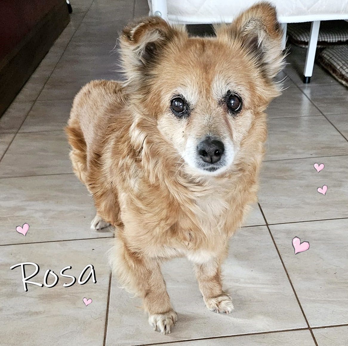 Unsere Pflegefamilie nahm sie auf und berichtet nur Gutes. Rosa ist eine kleine Familienhündin, die nette Spaziergänge liebt, auch Spielen, Lachen und Glücklich sein.