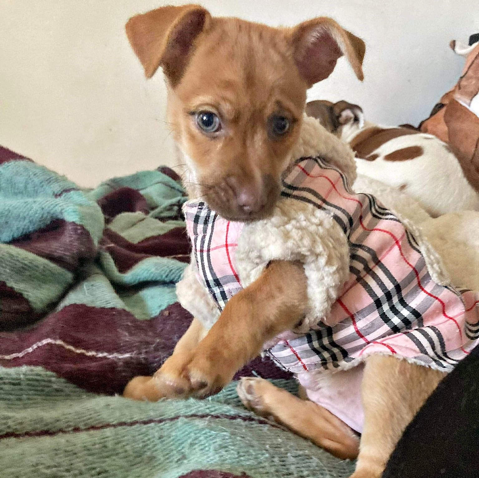 Die kleine Veve ist wohl tatsächlich ein Traum von einer Hündin. Eigentlich möchte sie sich noch weiter entfalten, aber schon jetzt ist sie absolut wunderschön. Ihr Gesichtchen zieht uns magisch an und ihre glasklaren Augen sprühen förmlich Herzchen. Neugierige Blicke voller Vertrauen und zwei witzige Ohren, die wie bei einem Plüschtier abstehen. Doch der Knopf im Ohr ist nicht zu finden. Veve ist ein kleines, freundliches Mädchen mit großem Herzen für das Familienleben. Schmusen, Lachen, Albern und auch Spielen, Rennen, Toben und die Welt entdecken, dieses wünscht sie sich so sehr – immer gemeinsam mit ihrer Muddi zusammen durch das Leben gehen. Veve zählt jetzt 3 Monate und ist gerade mal ca. 25 cm groß und wiegt knapp 4 kg. Sie wird immer ein kleines Mädchen bleiben und später etwa 8 kg erreichen. Sie wünscht sich so sehr eine Muddi, die sie weiterhin liebt und in den Armen wiegt. Klein Veve ist besonders liebebedürftig, denn sie wurde bei unserer Pflegefamilie vor die Tür gesetzt. Ohne ein Wort, ohne die Herkunft zu wissen, Veve lag da in dem Karton und schaute bittend zu uns auf. Sie war erst wenige Wochen alt und so begann eine innige Beziehung zu ihrer Pflegemuddi. Sie wiegte sie, sie fütterte sie, sie liebte sie wie ihr eigenes Kind. Veve entwickelt sich sehr gut und hat auch schon sehr viel gelernt. Sie geht gut an der Leine, sie ist unerschrocken und immerzu sozial zu allem und jedem. Es scheint, als strahlt sie mit der Sonne um die Wette und möchte glatt die ganze Welt umarmen. Hunde kennt sie im Zusammenleben und mag sie alle Alte Hunde, Junge Hunde – Veve ist alles Recht – wenn man sie nur lieb hat. Auch Katzen mag sie sehr und das Kuscheln mit ihnen ist für Veve eine Selbstverständlichkeit. Unsere kleine Schnuti ist rundum ein Schätzchen zum Liebhaben. Zu gerne möchte sie mit ihrer eigenen Muddi die Welt erkunden und kleine Abenteuer bestehen. In dem Wald spazieren gehen, über Wiesen laufen oder doch mal gemeinsam in den Urlaub fahren? Mit Veve ist wohl alles möglich, denn sie kennt keine Angst und hat ein unbändiges Urvertrauen zu ihren Menschen, die sie leiten. Veve ist fit und agil, sehr leicht zu händeln und außerdem lernt dieses Mädel sehr schnell Neues dazu. Sie ist gesund - doch ein kleiner, unscheinbarer Nabelbruch könnte gegebenenfalls bei der späteren Kastration mit behoben werden. Viele Hunde haben diesen kleinen Gnubbel unter dem Bauch, er ist bei Wunsch schnell zu beheben. Klein Veve ist nun bereit für Sie! Wer wird mit ihr die Welt entdecken und sie abends liebevoll in den Schlaf wiegen?