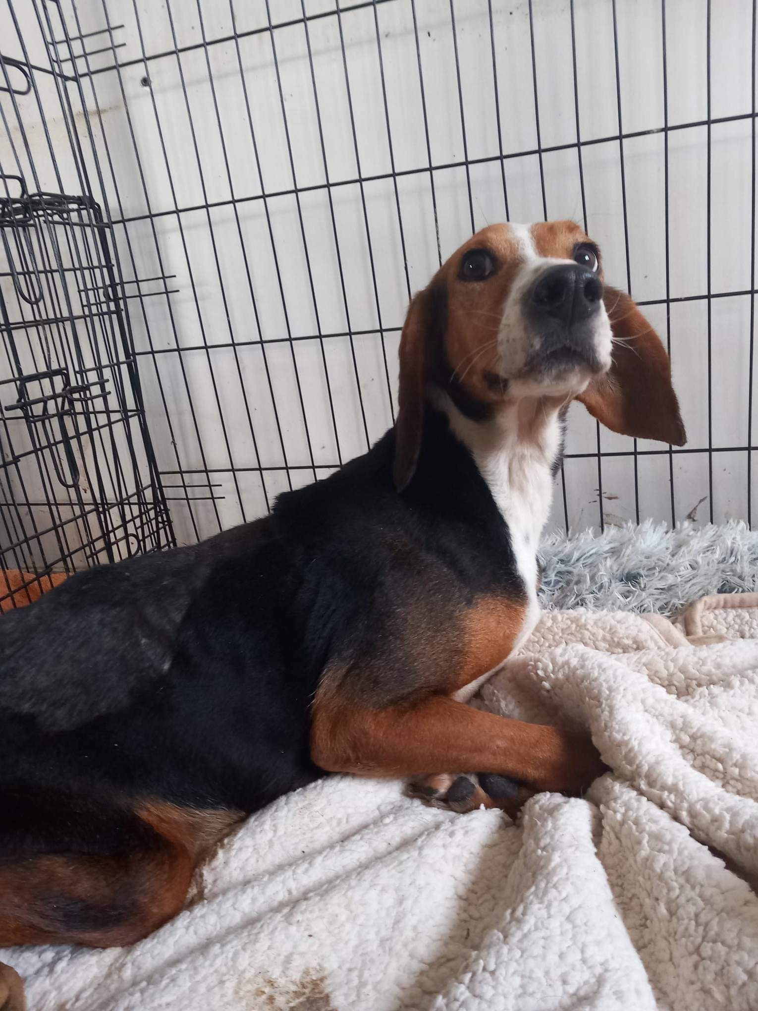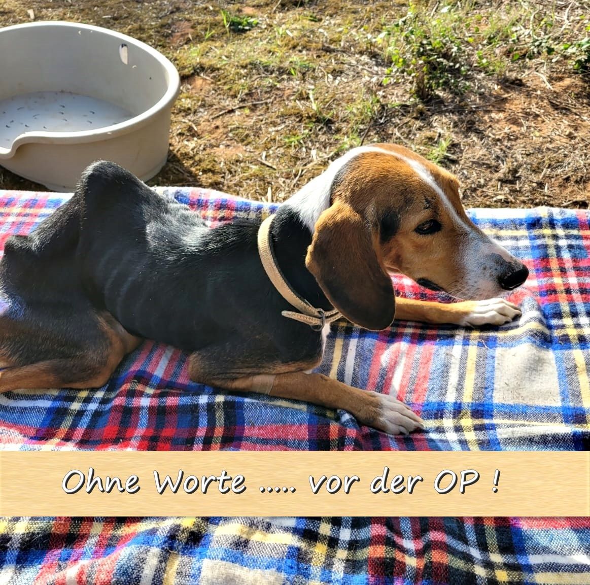 Unsere Zoe ist ein sanftmütiges Mädchen, einige Wunden von früher zieren noch ihre Seele – diese trägt sie stumm und geduldig als Mitbringsel herum. Wie eine Prinzessin zeigt sie sich, denn sie beschwert sich niemals, sie trägt ihr Schicksal mit Fassung und lächelt sogar dabei. Sie ist ein vornehmes, geduldiges und sehr ruhiges Mädchen mit großem Harmoniebedürfnis. Sie liebt die Menschen sehr und genießt jede Minute, die man sich ihr widmet. Andere soziale und sanfte Hunde sind ihr gerne willkommen. Draufgänger mag sie aber nicht, dann duckt sie sich, um übersehen zu werden. Dieses ist verständlich, denn unsere liebevolle Zoe hat ein riesengroßes Problem. Ihre Wirbelsäule ist gänzlich gebrochen. Sie war in einem erbärmlichen Zustand – ihr Leben hing am seidenen Faden. Doch der Tierschutz half und so wurde sie von einem herbeigerufenen Spezialistenteam einer großen Tierklinik operiert. In einer stundenlangen Op wurde ihr Leben gerettet. Zoe dankt es mit ihrer uneingeschränkten Liebenswürdigkeit. Ihr sanftes und liebevolles Wesen macht tatsächlich alles wett.❤️Ihre Augen funkeln und versprühen Herzchen. Sie ist der Inbegriff für Liebe und Harmonie. Zoes warmherzigen Blicke sind sanft und sie liebt das Leben sehr. Leider kann sie im Moment nicht stehen oder gehen, sie trägt einen Pamperspopo und sie ist auf unsere Hilfe angewiesen. Aber was macht das schon? Die inneren Werte sind 100 mal wichtiger – und tatsächlich ist unsere Zoe ein herausragendes Schätzchen. Sie ist bereits aus der Klinik entlassen und lebt nun in einer vorläufigen Pflegefamilie, die sie kurzfristig aufnahm. Hier bekommt Zoe eine Nachversorgung ihrer OP Wunde und wird liebevoll auf einen Wechsel in eine eigene Familie vorbereitet. Zoe hat uns große Kosten verursacht, es wurde alles Menschenmögliche getan, damit Zoe leben darf. Ein Wunder ist geschehen und tatsächlich erholt sie sich zusehens. Sie lacht, sie schmust, sie ist eine unendlich dankbare Hündin mit besonderem Liebreiz. Wir ordnen sie der Rasse “Beagle Harrier“ zu. Eine sehr liebevolle Rasse, wie man sie noch von Gemälden des Hochadels kennt. Mit ihren ca. 50 cm Schulterhöhe und derzeit 15 kg ist sie gut zu händeln und wird ihnen eine beste Freundin sein. Mit ihren jetzt 1,5 Jahren hat sie noch jede Chance auf ein schönes Leben. Darum suchen wir händeringend ein gutes Zuhause, eine Familie, die sich mit gehandicapten Hunden auskennt oder guten Willens ist, es zu lernen. Ein ebenerdiges Zuhause mit Garten wäre unser Wunsch für diese Traumhündin. Denn dieses ist sie allemal.❤️